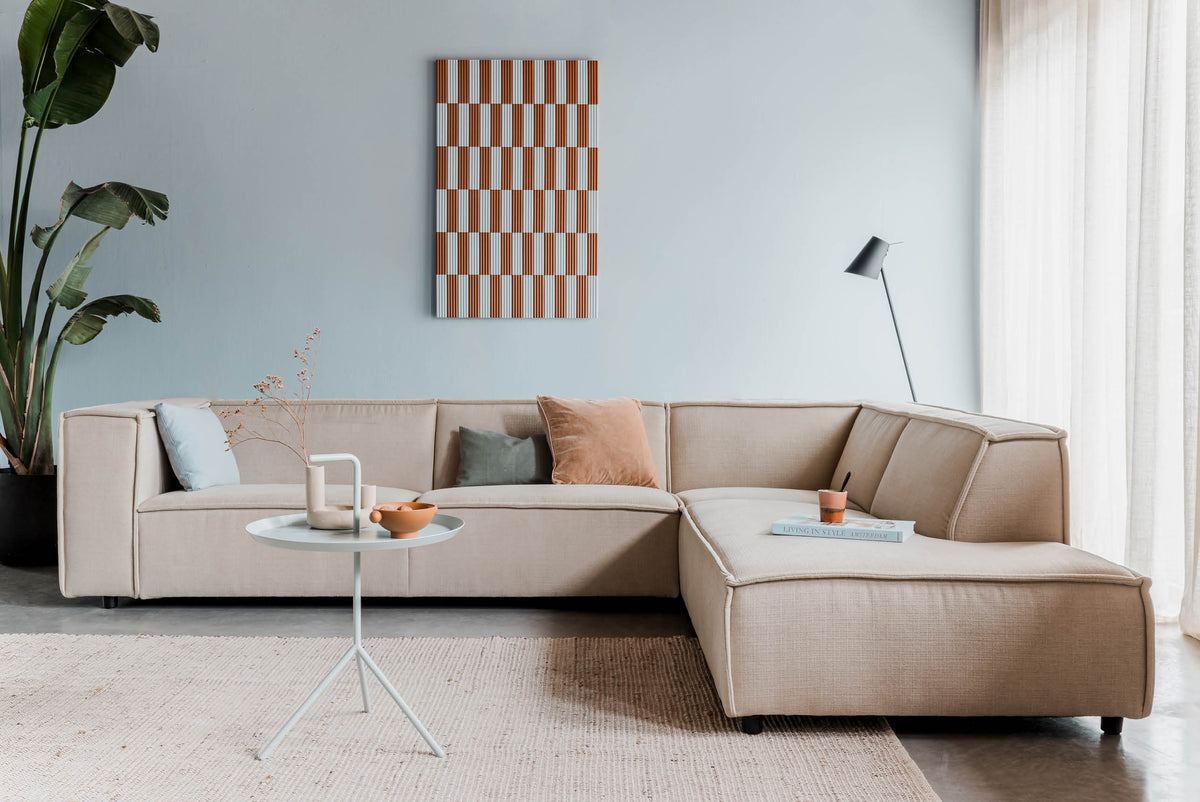 Le repose-pieds Sommer est composé d'une carcasse en bois, équipée de ressorts nosag en métal, surmontée de ressorts intérieurs Bonell et de mousse froide HR. Il s'agit d'un rembourrage de haute qualité qui s'assouplit à l'usage. En fonction du poids du corps et de l'intensité de l'utilisation, la rigidité du rembourrage et des ressorts diminue de 10 % dans la phase initiale, pour finalement rester constante à 85 % de la nouvelle valeur. Le repose-pieds Sommer est rembourré de manière un peu plus lâche afin de créer de l'espace dans le tissu et de créer des plis décontractés. Cela fait partie du modèle et donne à Sommer son aspect robuste. Les larges coutures sont caractéristiques de ce modèle.